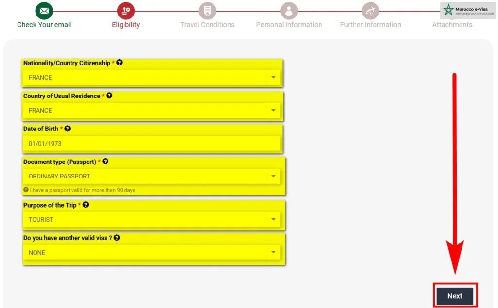 4. Complete the first section by providing your basic details (nationality, country of residence, date of birth, passport type, travel purpose, and details of any valid visa or residence permit). Click “Next” to proceed.