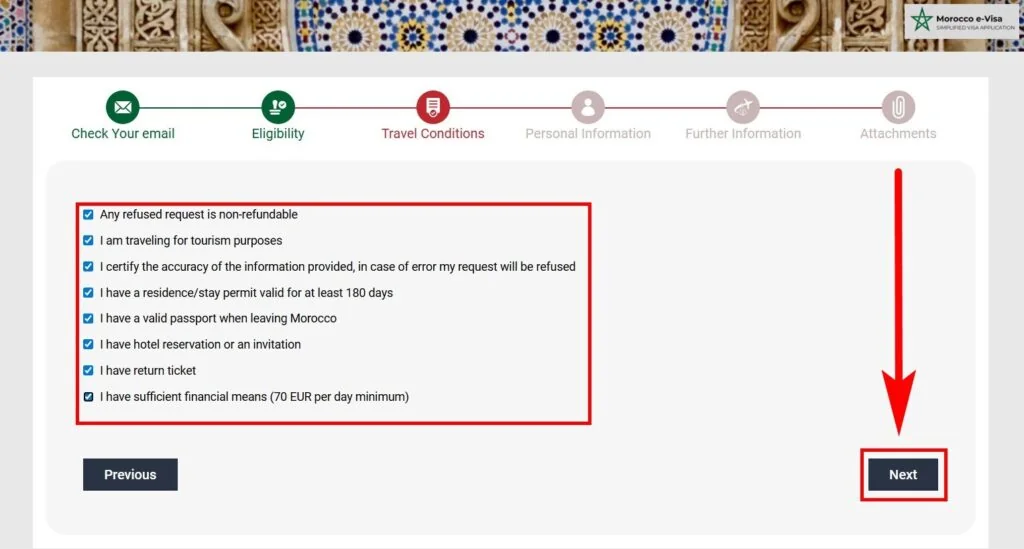 5. Read the travel conditions, tick the agreement boxes, and continue by clicking “Next”.