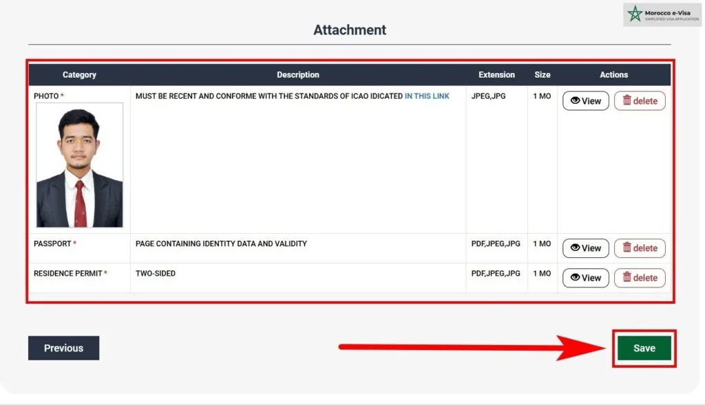 8. Upload the necessary documents: a recent passport-sized photograph, the bio-data page of your passport, and, if applicable, a residence permit or valid visa. Click “Save” when done.