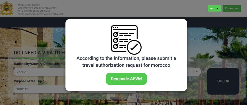 NOTE: The AEVM (Autorisation Électronique de Voyage au Maroc) is mandatory for Ghanaian citizens; airlines will not permit boarding without this authorization.